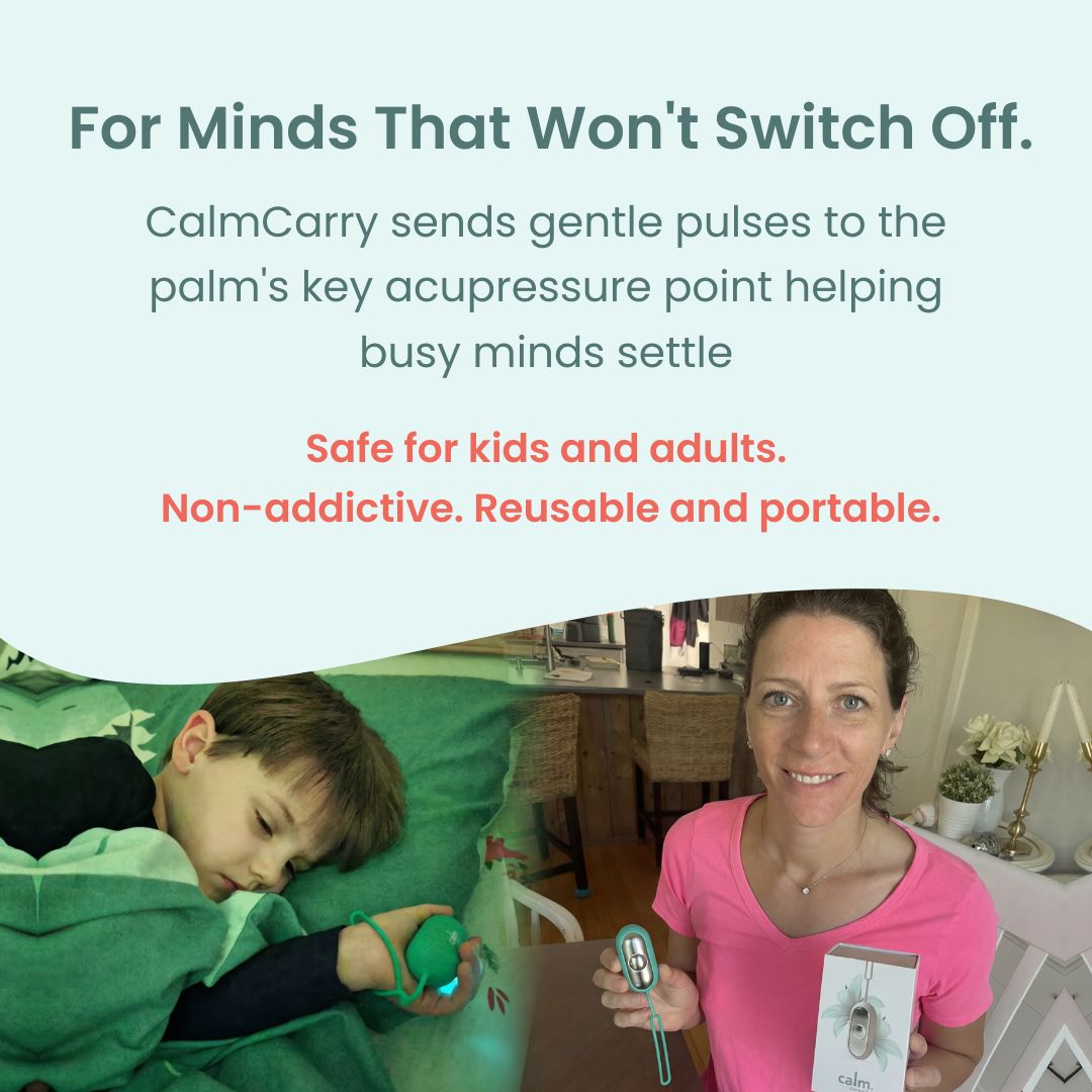CalmCarry is a handheld device that uses gentle micro-pulses to target a pressure point in the palm used for over 1,000 years to support calm and relaxation. Simply hold it in your hand and let the soft pulses do the work. It's designed to help kids and adults unwind naturally.